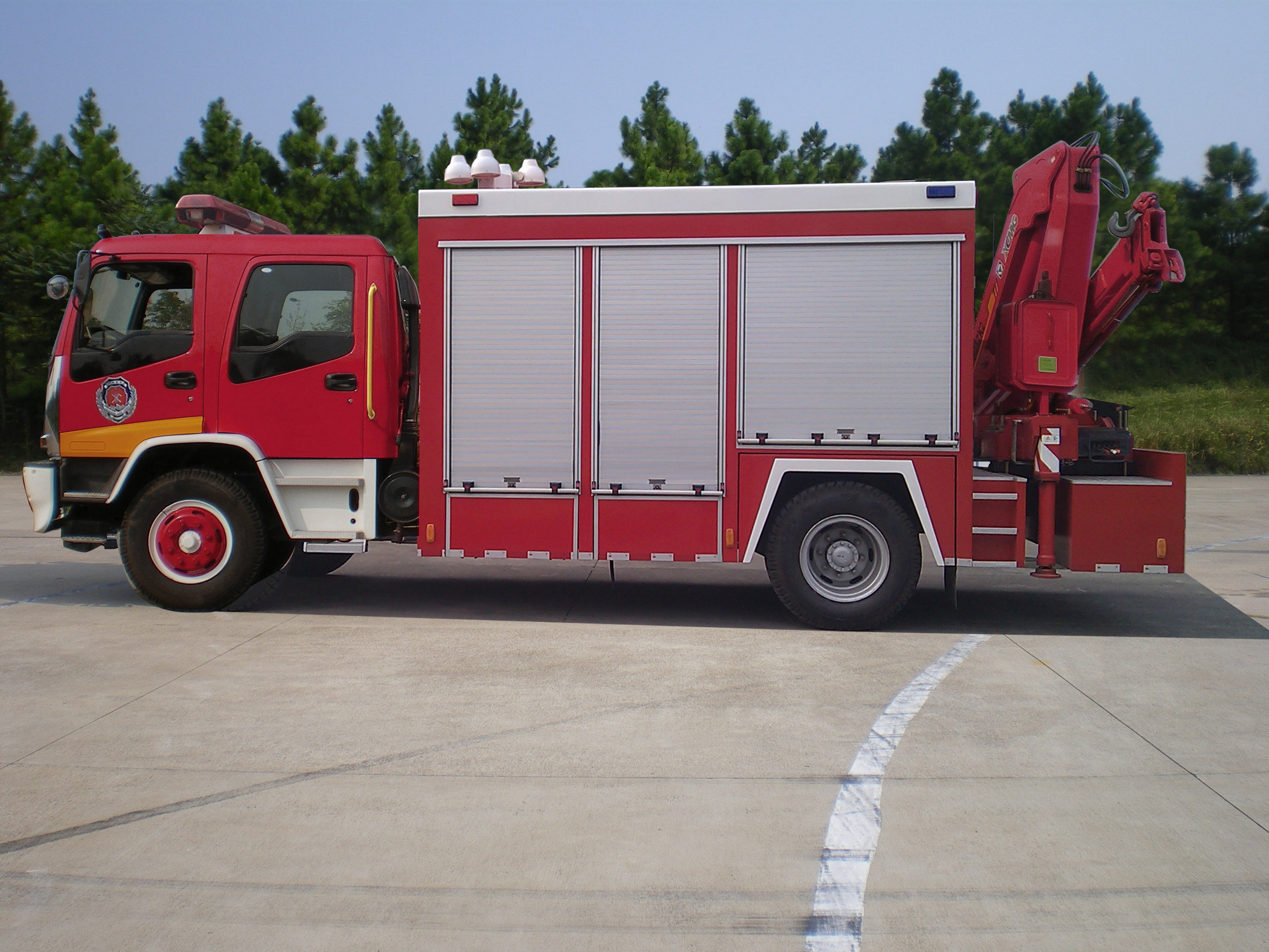 JY80 emergency rescue fire truck is equipped with the original U.S. champion electric winch N16800XF; it adopts Honda generator SHT11500; the roof is equipped with lifting lighting system YZH4-5.04CA; and the rear is equipped with a hydraulic truck crane SQ5ZK2 produced by XCMG. The equipment compartment adopts the structure of rotation and pulling, which has a high integration degree, and is convenient to use.